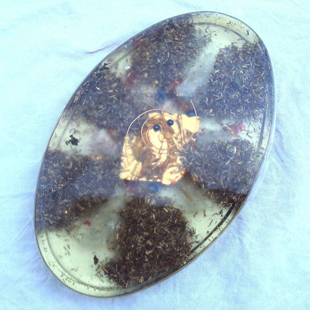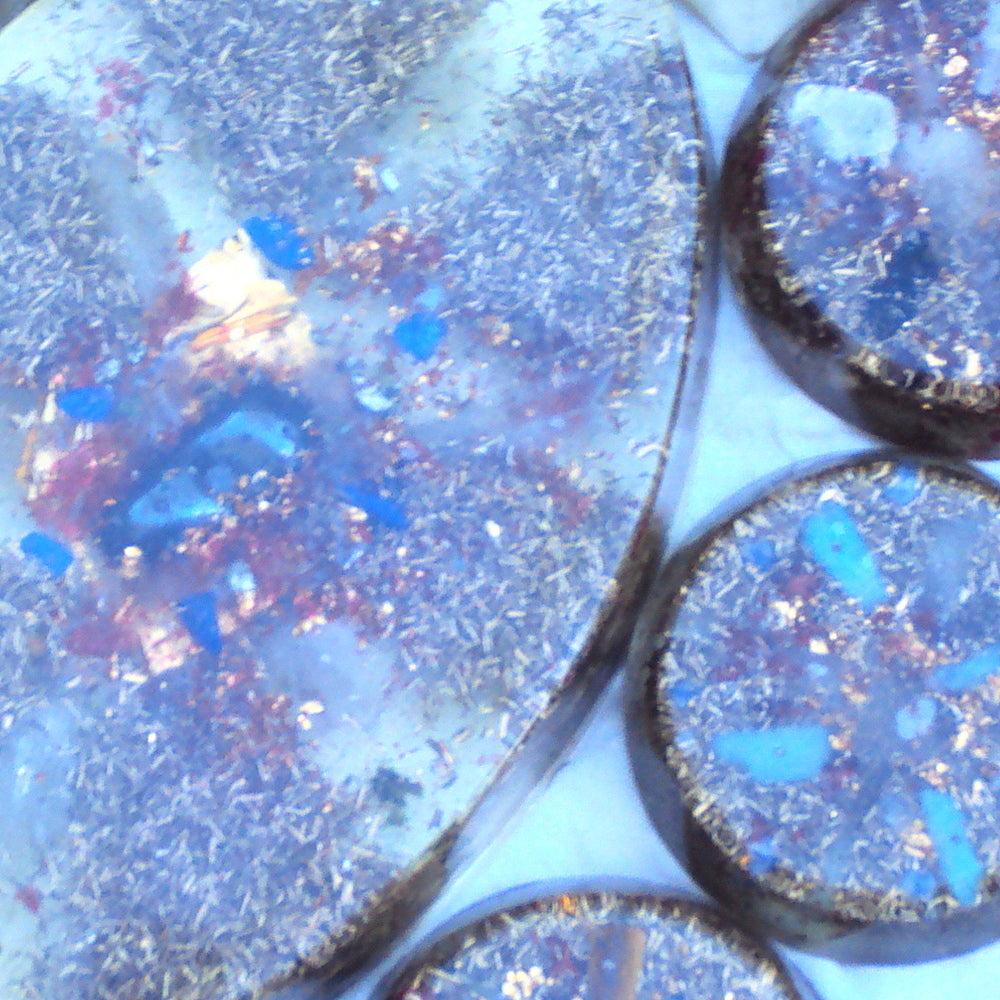 Fine mineral powders: Selenite, blue kyanite, pyrite.