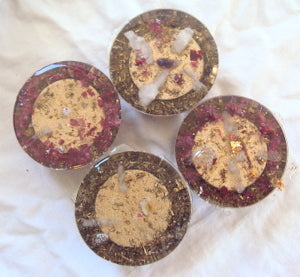 Selenite, blue kyanite and pyrite powder. Flowers and herbs from Mt Carmel. 24K Gold leaves, enhanced by aluminium and brass powder, brass metal.