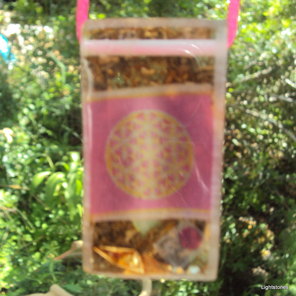 Contains semi-precious gemstones and crystals: a double terminated quartz crystal, rose quartz, emeralds, danburite.