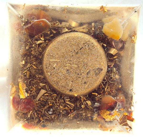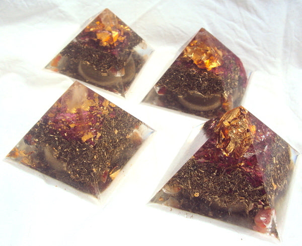 Each pyramid contains: 1 herkimmer diamond, 4 carnelian, ametyst, gold leaves, flowers of Mt Carmel, blue kyanite-pyrite-selenite-emerald powder,aluminium and brass powder, brass metal.